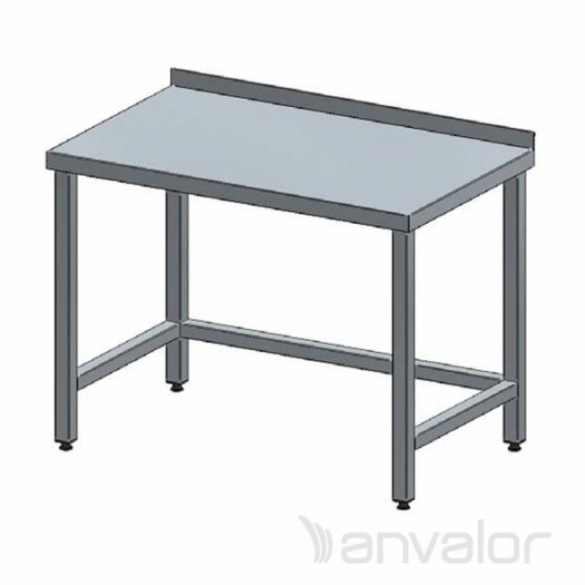 Rozsdamentes munkaasztal hátsó felhajtással és alsó polccal, nyitott. A fedlap rezgésmentes, 50 mm vastag, a lábak szintezhetőek.