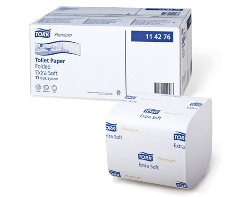 A Tork Folded toalettpapír (T3) higiénikus laponkénti adagolást tesz lehetővé, így csökken a hulladékképződés és a karbantartás költsége. A Tork Premium Extra Soft hajtogatott toalettpapír látványos és kiváló minőségű termék. A rendszer elsősorban alacsony és közepes forgalmú helyiségekbe való, elsősorban az egészségügyi és Horeca szektorban.