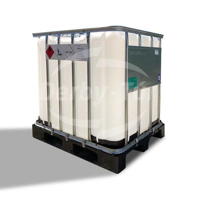 Műanyag 1000 literes IBC tartály 2,5 x 2,5 év ADR vizsgával, kötelező bárcákkal és a gázolaj közúti szállítására vonatkozó szabályozások leírásával, amelyek betartásával legálisan szállítható közúton gázolajjal töltve is.