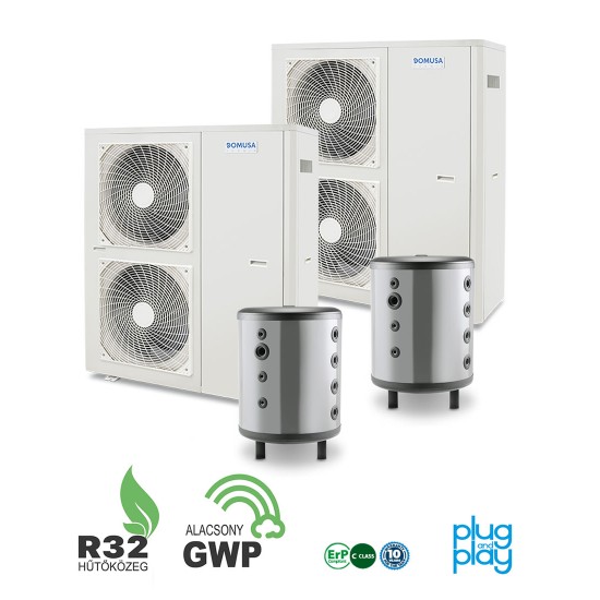 Mit tartalmaz a telepítési csomag: 3 db Domusa Dual Clima R 16 kW-os 1 fázisú levegő-víz hőszivattyú 2 év teljeskörű, és 5 év kompresszor garanciával 3 db Domusa BTS 150 literes beltéri...