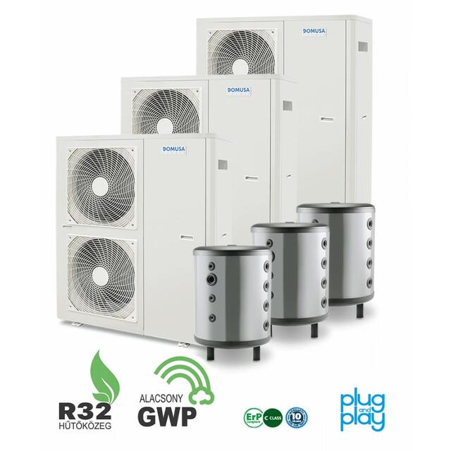 Mit tartalmaz a telepítési csomag: 3 db Domusa Dual Clima R 16 kW-os 1 fázisú levegő-víz hőszivattyú 2 év teljeskörű, és 5 év kompresszor garanciával 3 db Domusa BTS 150 literes beltéri...