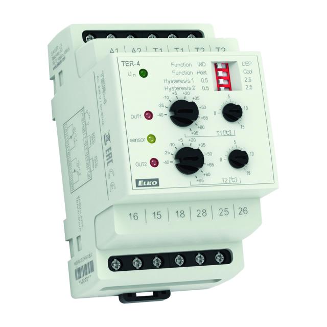 - Kétcsatornás analóg termosztát a hőmérséklet ellenőrzéséhez és szabályozásához, -40..+110 °C közötti hőmérséklet tartománnyal