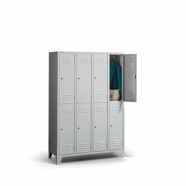 Biztonsági zár (két kulccsal); ruhaakasztó rúd; 120 mm-es láb; szellőzés perforációval; polc / kalaptartó;